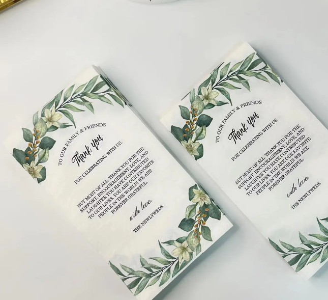 Uanset om det er en fødselsdagsfest, et tema bryllup eller en virksomheds branding -begivenhed, supplerer brugerdefinerede trykte væv perfekt begivenhedens tema og farveskema. Forestil dig en udsøgt bordindstilling, hvert væv, der er præget af parets logo, et virksomhedsslogan eller et festligt motiv - denne slags tankevækkende opmærksomhed på detaljer demonstrerer øjeblikkeligt arrangørens engagement i kvalitet. Dette giver ikke kun bekvemmelighed for gæsterne, men forstærker også subtilt begivenhedens tema.